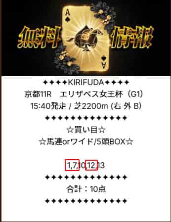 無料予想でエリザベス女王杯を買いました。 推奨されていた5頭BOXからワイドがしっかり的中。 金額は大きくないですが、無料で当たるのは素直にありがたいw
