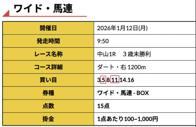 朝イチから腰が抜けました。中山1Rの馬連BOX、15点予想でまさかの133,700円獲得! 回収率891%って、無料情報のレベルじゃないですよね。 11番人気の激走を完璧に読み切るプロの相馬眼に震えました