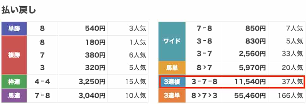 3連複無料的中しました!3-7-8 11,540円✖️1点500円=57,700円獲得!