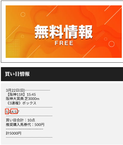 阪神大賞典の無料予想に乗ってみました。3連複で15,400円の払い戻し。