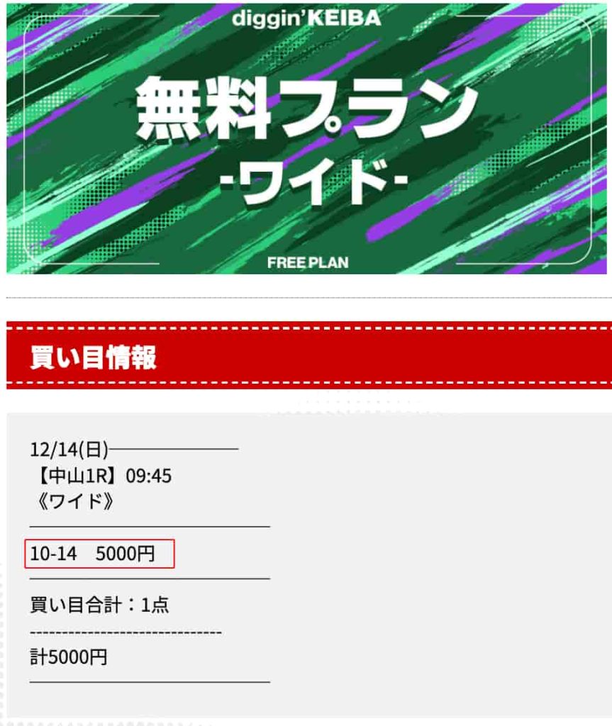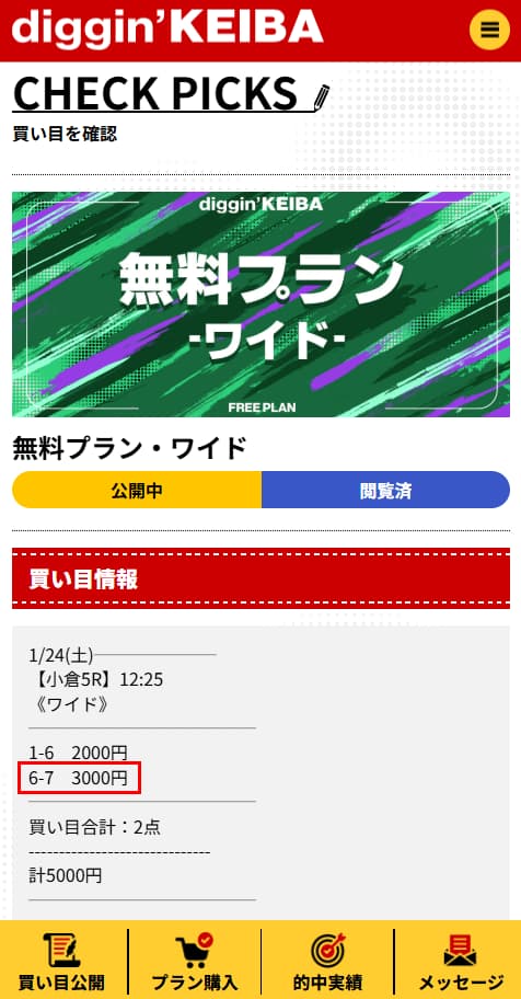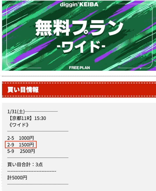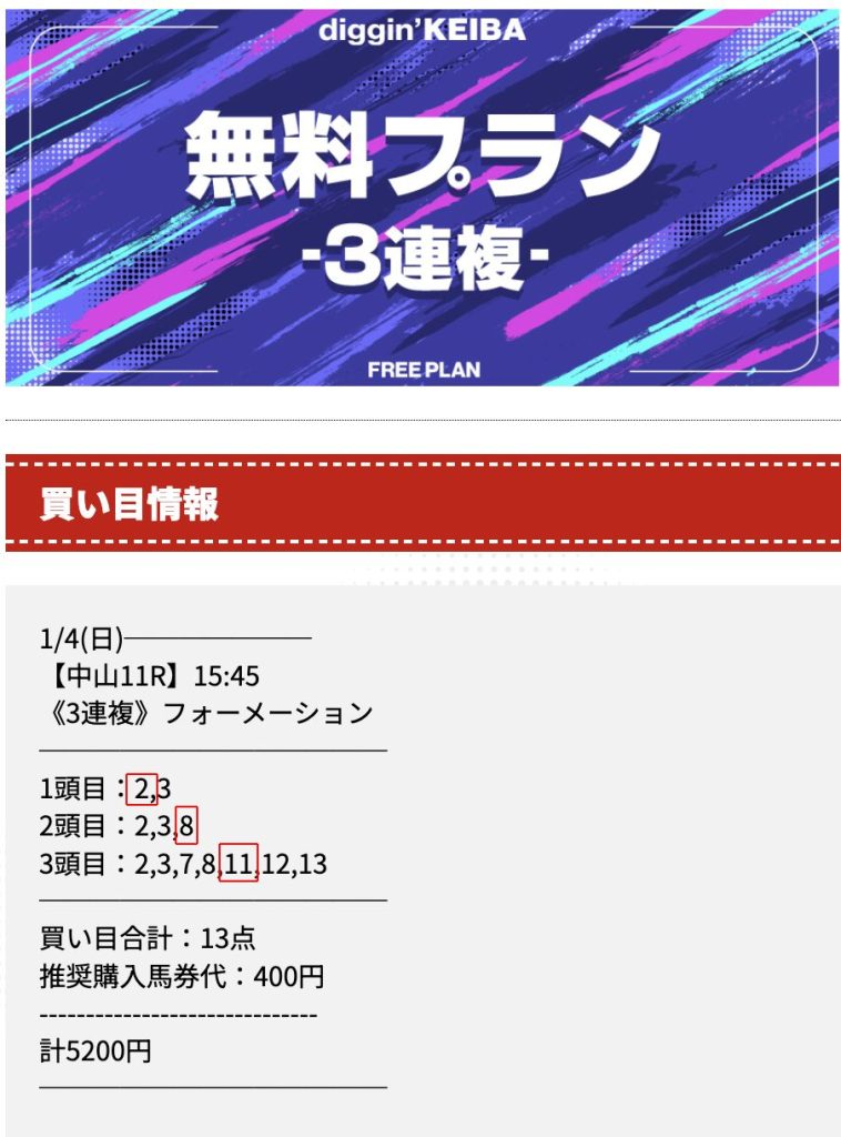 diggin' KEIBAさんの無料プラン、マジで当たりますね! 3連複13点って絞られてたから、自分でも迷わず買えました。 11番が来たときは震えましたが、配当59.6倍もつくなんて最高です。 投資5,200円が2万超えになって、今夜は美味しいもの食べに行きます!