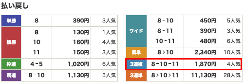 | 払い戻し | 1,870円 |