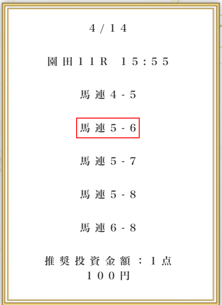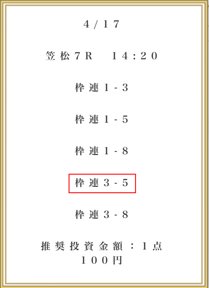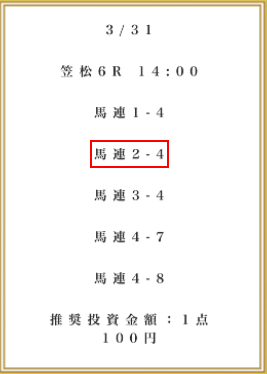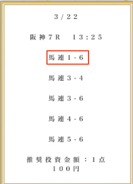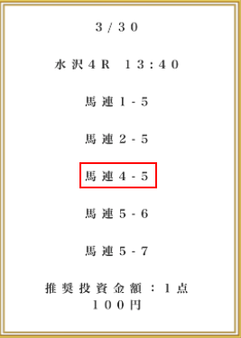 | 推奨馬券代 | 1点100円 |