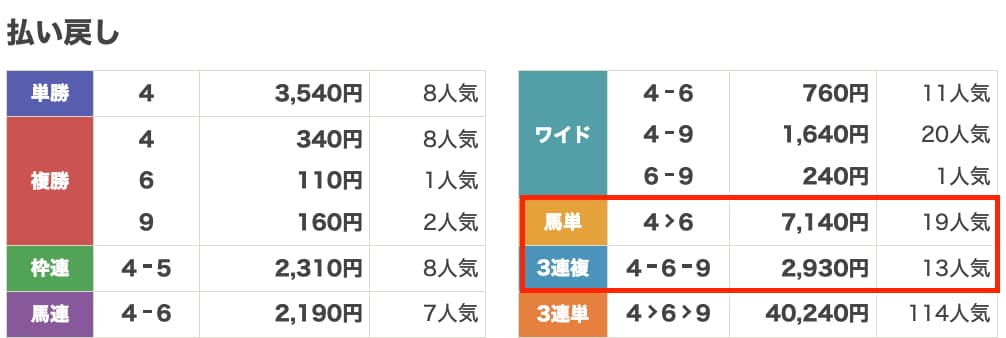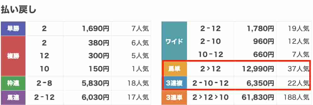 | 払い戻し金額 | 馬単→12,990円 3連複→6,350円 |