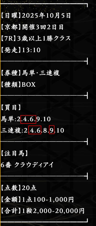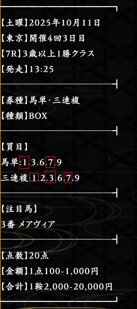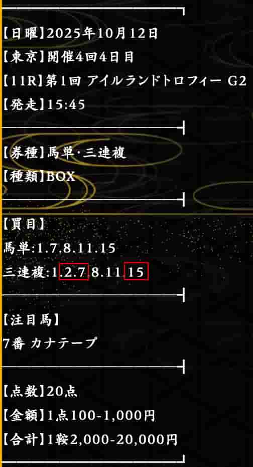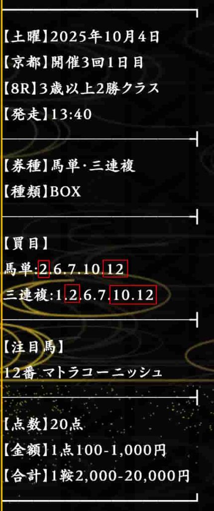 | 抑えきれぬ憤怒 | 土曜2鞍・日曜2鞍 合計4鞍 | 3連単 | 12点/1点500円 | 300万円以上 |