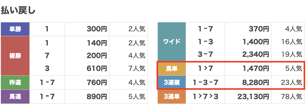 | 結果 | 馬単→1 -7 3連複→1 – 3 -7 |