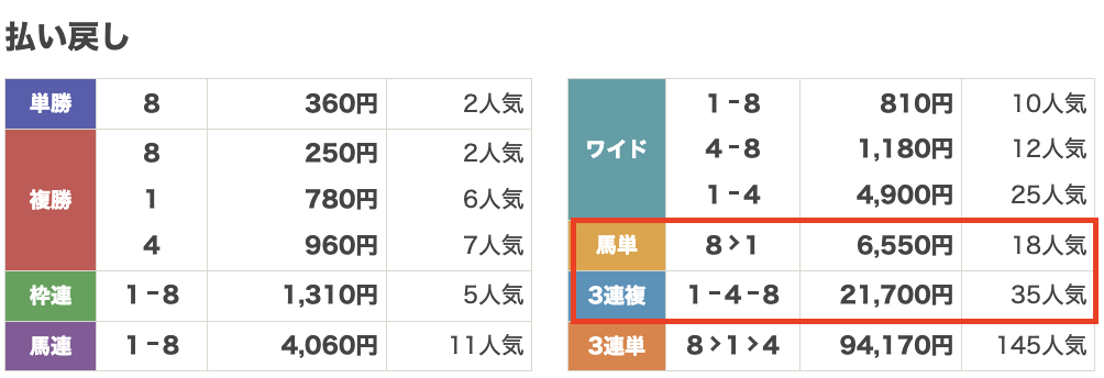 | 結果 | 馬単→8 -1 3連複→1 – 4 -8 |