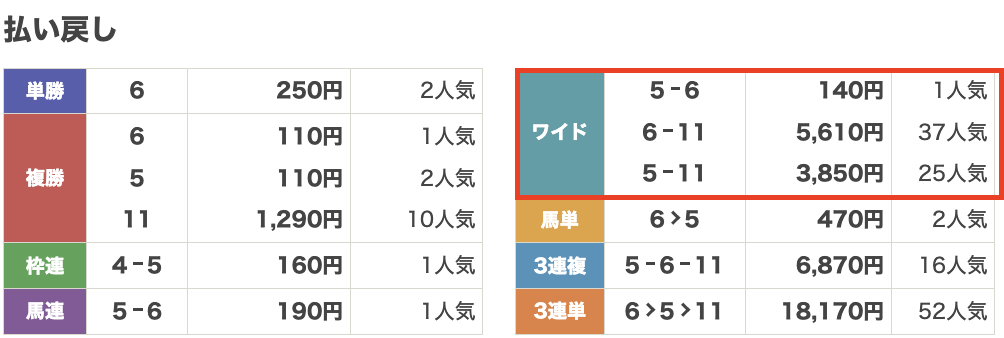 | 払い戻し | 5 – 6→140円 6 -11→5,610円 5-11→3,850円 |