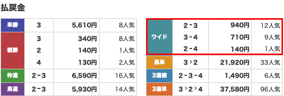 | 払い戻し | 2 – 3 →940円 3-4→710円 2-4→140円 |