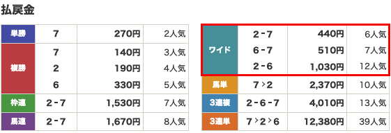 | 払い戻し | 2 – 7→440円 6-7→510円 2-6→1,030円 |