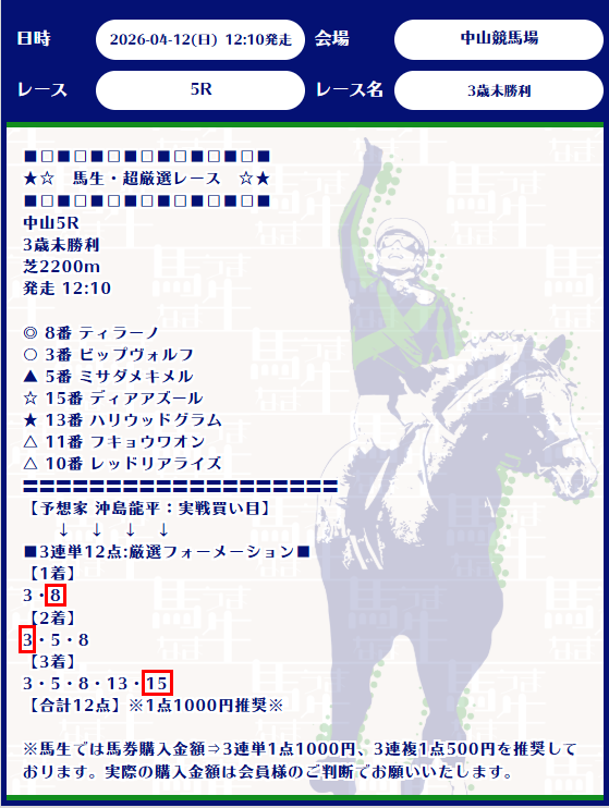 推奨通り1点1000円で勝負したら、47万超えの払い戻しに震えました…。3連単12点でこの精度は本物。4月早々、最高の軍資金ができました!