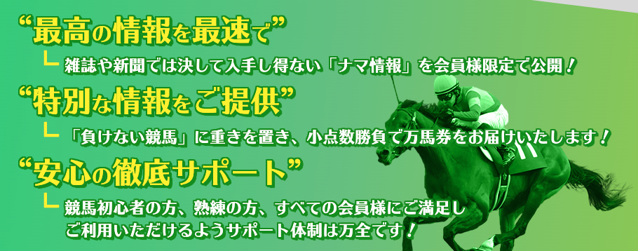 馬生は、雑誌や新聞では決して入手できない現場直結の極秘情報を駆使し、会員の利益を最優先に掲げる競馬予想サイトです。